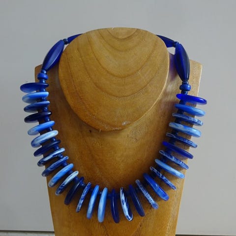 Et stort udvalg af farver og designs præsenteres her. Der er 17 trekantede perler (3 x 3,5 cm) og 3 "klør-perler". (3 cm høje). Nogle ridser og afskalninger har opstået på grund af deres lange brug. Indsamlet i Mali i slutningen af 1990'erne.