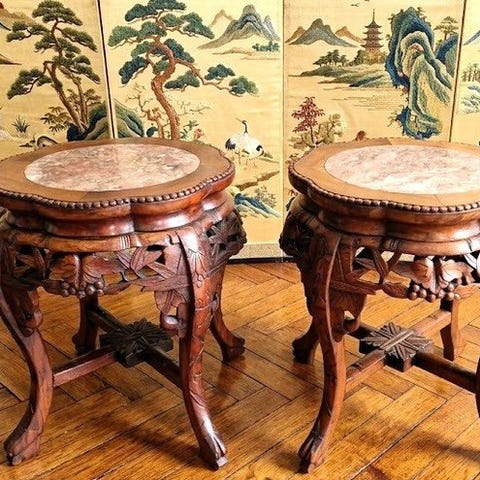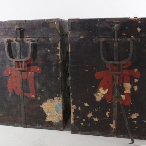 To kinesiske træskabe med et udtrækkeligt topag, der afslører en kiste og tre skuffer, i fremragende stand med få tegn på slid, dateret 2000–2010, mål: 58 cm højde, 50 cm bredde, 25 cm dybde. Klik på den blå "gå til varen" knap, for at købe eller byde på denne vare. Den samlede pris vil blive vist inden du afgiver dit bud.