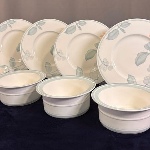 Disse stykker tilhører det udsøgte "Aria"-kollektion, kendt for sin sarte blomsterdekoration i bløde pastelfarver. Kombinationen af ferskenfarvede blomster og dæmpet blå-grå løvværk mod den mælkede hvide benporcelænbasis skaber en sofistikeret, luftig æstetik til enhver borddækning.