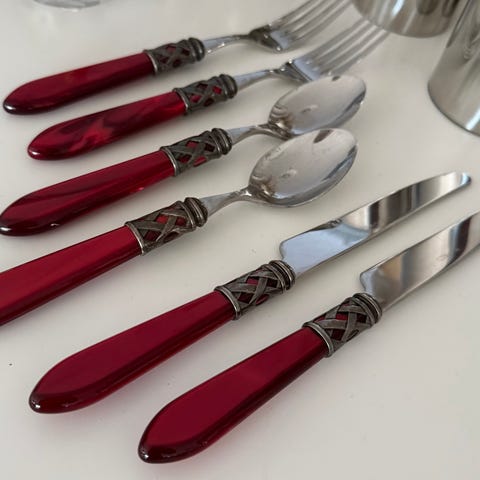 Interessant denne komplette og elegante opstilling til et bestik sæt foreslået af den franske fabrikant St.Joanis France til 4 personer i rustfrit stål støbt med et håndtag, der er stærkt perlemorbelagt i farven rosa magenta og fuldendt med en virole, som er prægede og stærkt sølvfarvet. Et elegant sæt der giver bordet en tone af prestige.