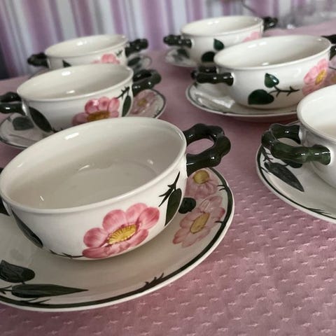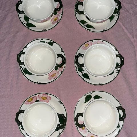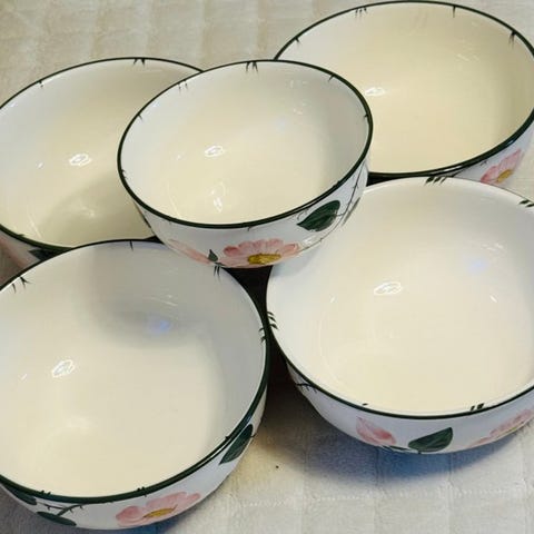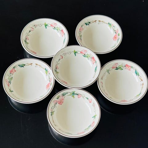 Et sæt skåle med en smuk dekoration. Se billederne—de er en del af beskrivelsen, og de er helt nye. 5 af dem viser tegn på brug, hvilket er normalt med årene. Det sendes med sporingsnummer, forsikret for at give yderligere garanti, så det ankommer i perfekt stand.