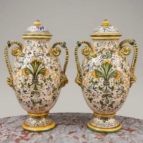 To håndmalede keramiske vaser med låg, hvid og blå farver med blomsterdekorationer i japansk stil, oprindelse Italien, dateret til 1940–1950, mål: bredde 13 cm, højde 23,5 cm, dybde 13 cm, i fremragende stand med let slid på grund af ældning. Klik på den blå "gå til varen" knap, for at købe eller byde på denne vare. Den samlede pris vil blive vist inden du afgiver dit bud.