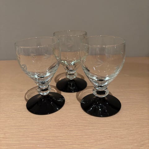 Snapseglasset har en bladranke slebet i glasset og har en sort fod.
