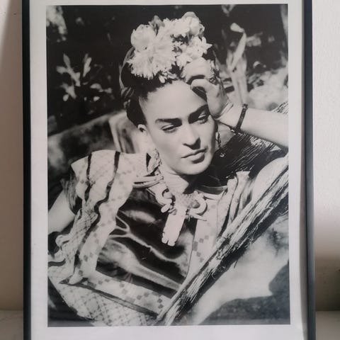 Diego i mine tanker er et af Frida Kahlos mest intense og symbolske selvportrætter, hvor identitet, kærlighed og lidelse smelter sammen i et enkelt billede. Kunstnerens ansigt træder frem forfra, indrammet af en udsmykket hovedbeklædning der åbner sig som et spind af tråde og rødder, mens på panden ses Diego Rivera’s portræt, en konstant og dominerende tilstedeværelse i hendes følelsesmæssige liv. Kompositionen, domineret af varme og gyldne nuancer, forvandler privat smerte til ikon og gør det ubrydelige bånd mellem tanke, hukommelse og følelse synligt.