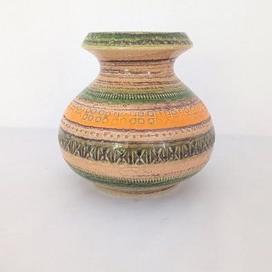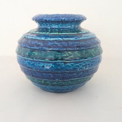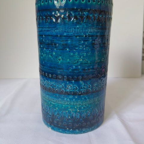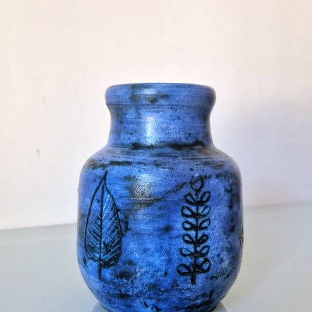 Et sjældent Rimini Blu keramisk vase, designet af Aldo Londi og produceret i Italien af Bitossi og Flavia Montelupo, fra 1970’erne–1980’erne, måler 13,5 cm i højden og 9 cm i bredden, i fremragende stand med lette brugsspor af alder. Klik på den blå "gå til varen" knap, for at købe eller byde på denne vare. Den samlede pris vil blive vist inden du afgiver dit bud.