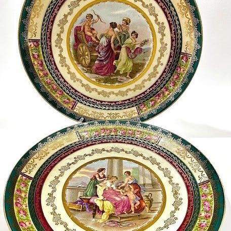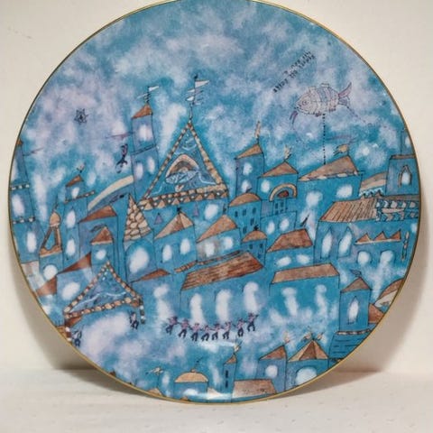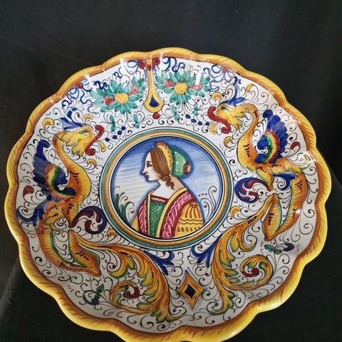 Håndmalet tallerken af Pinuccia Verrò, markedsført af Richard Ginori, har nogle defekter som er angivet på billedet.