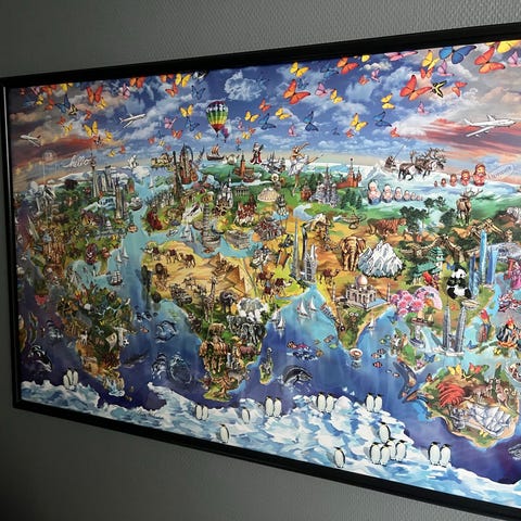 Stil & dekorativ interesse: denne illustrerede kort kombinerer stiliseret kartografi, kulturelle symboler og retrodesign i en rig og farverig komposition. Hver kontinent er fremstillet med grafiske elementer, der vækker dets
