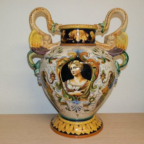 Magnifik håndmalet fajance høj karaffel i Vieux Rouen-stil fra Portugal, ca. 1950, glaseret keramik med polykrom florale motiver, to skulpturale kanin-håndtag, 40 cm bred, 50 cm høj, 30 cm dyb, i fremragende vintage stand. Klik på den blå "gå til varen" knap, for at købe eller byde på denne vare. Den samlede pris vil blive vist inden du afgiver dit bud.