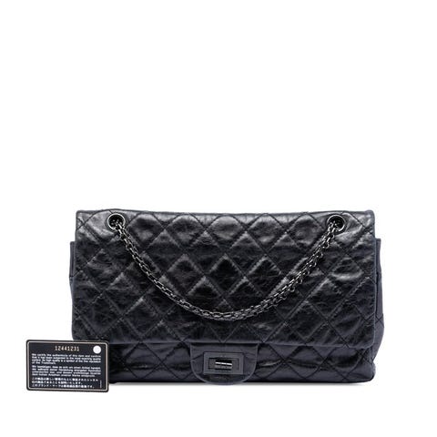 Chanel Reissue 2.55 226 i lakkeret kalveskind, med klassisk ruthinium-finish og rombe-quilting. Dobbelt flap, Mademoiselle-lukning i drejning, glidelignende kæde til skulder- eller crossbody-bæring og baglommer. Inderside med lynlåslomme og åbne lommer.
