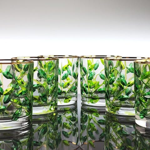Graveringerne er elegante grene med små blade: hver af dem er håndmalet med klare farver i lysegrøn og mørkegrøn.