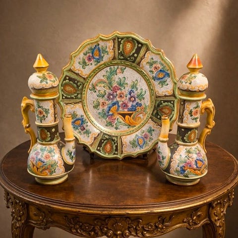 Disse elegante italienske maiolika-vaser har en raffineret fugle- og blomsterdekor i blå- og hvidtoner, typisk for Derutas kunstneriske tradition. Hvert detalje er håndtegnet af mesterhåndværkere, hvilket gør hvert stykke unikt.