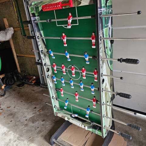 AO bordfodbold i bordmodel med grøn spilleplade. Spillet har to hold med figurer monteret på metalstænger med plastikhåndtag. Der er manuelle måltællere i hver ende samt medfølgende lille fodbold. Velegnet som kompakt bordspil til indendørs brug.