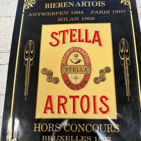 Vintage Paulaner Salvator skilt fra Tyskland i Bauhaus-stil, tinplade med sort baggrund og røde og guld detaljer, 40 × 30 cm, ca. 1980–1990, original/officiel, i pæn brugt stand med mindre aldersmærker og pletter. Klik på den blå "gå til varen" knap, for at købe eller byde på denne vare. Den samlede pris vil blive vist inden du afgiver dit bud.