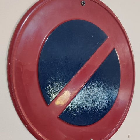 Originalt belgisk 60 km/t vejskilt i støbt metal med tredimensionelt relief, 21 × 21 cm, ca. 1971, i god brugstilstand med små tegn på ælde og pletter. Klik på den blå "gå til varen" knap, for at købe eller byde på denne vare. Den samlede pris vil blive vist inden du afgiver dit bud.
