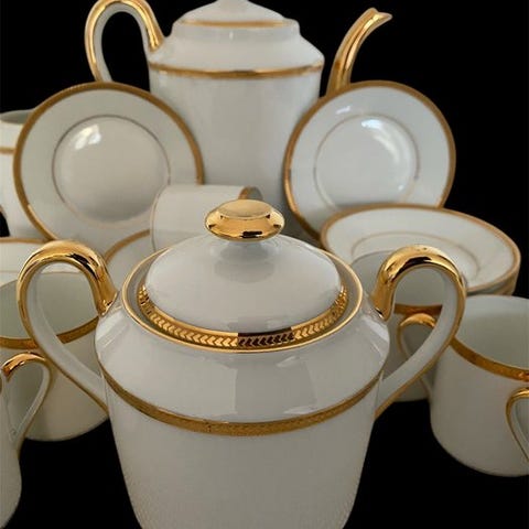 Pragtfuldt vintage service i førsteklasses hvid porcelæn til 10 personer signeret Richard Ginori, kommet fra den berømte Doccia-fabrik. Sættet skiller sig ud ved et raffineret og tidløst design, kendetegnet ved et delikat mønster af lodrette ribber og ædle detaljer i zecchino-guld.
