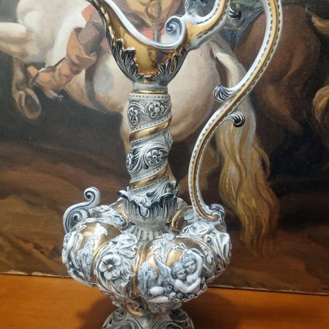 Hånddekoreret keramik i Bassano-stil. Bassano-stil. Vasen har en buet krop, en slank hals med en bred, krogformet åbning og et stort forgyldt håndtag (de forgyldte dele er i guld), hviler på en koordineret sokkel og har en samlet højde på 120 cm. Dekorationen karakteriseres ved en craquelé-effekt på en hvid/creme baggrund, beriget af et bredt blomstermotiv med centralt placerede roser, alt sammen omgivet af gyldne friser. En særegenhed ved denne artikel er, at den også har et blomsterdesign i den anden del, hvilket sjældent ses i denne type artikler.