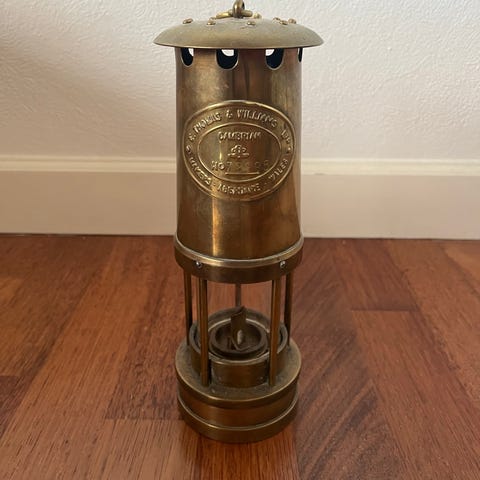 Dette er en lille messing minde-/erindringslampe til minearbejdernes sikkerhed, ikke en almindelig arbejdslampe. Købt i Bruxelles.