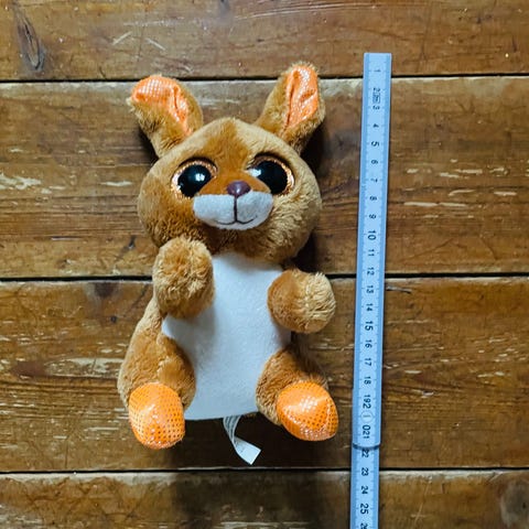 plysdyr formet som en kanin i grå farve. Figuren har lange ører, blød pels og lyse poter med dekorative detaljer. Plysdyr kan anvendes som legetøj til børn eller som pyntegenstand på værelse eller taske, afhængigt af barnets alder og behov. Velegnet til indendørs brug.