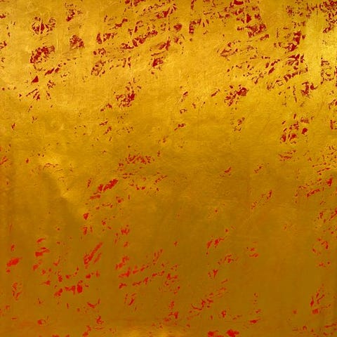 Denne maleri fremviser en ensom menneskelig skikkelse, der træder frem gennem lagdelte, gestuelle penselstrøg. Bygget op i neddæmpede nuancer af sort, grå og off-white, båret over en overflade som bærer en tæt, vejrslidt hud af materiale—påført, trukket og delvist slettet. Subtile gyldne detaljer dukker op gennem hele værket, fanger lyset og skaber en skiftende, næsten skimrende effekt.