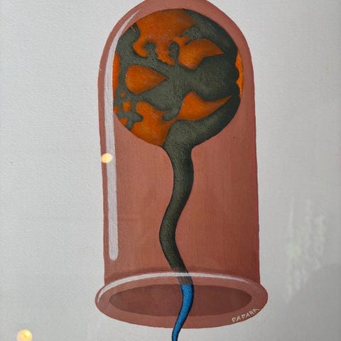 Dette udtryksfulde oliemaleri af Daniel Jerzy, skabt i Kraków i 1988, præsenterer en slående og følelsesmæssigt ladet komposition, der straks fanger beskuerens opmærksomhed. Værket skildrer en central figur prydet med medaljer, konfronteret af forvredne, næsten teatralske karakterer og en gådefuld svævende kvindefigur øverst. Scenen balancerer mellem satire og introspektion og vækker temaer som identitet, autoritet og anerkendelsens vægt.