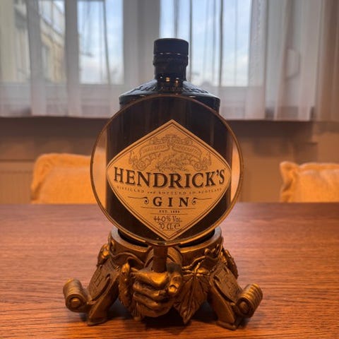 I fremragende stand og i begrænset udgave, reklamedisplay af ginmærket Hendrick's fra Frankrig, og lavet i 1980'erne. Reklamegenstand af det verdensberømte mærke har en gylden farve, og der står et forstørrelsesglas til at forstørre logoet og mærket.
