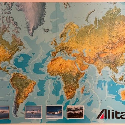 Ce visuel puissant et graphique, signé par le photographe renommé Georg Gerster, est représentatif du style moderniste des campagnes Swissair, mettant en avant des paysages impressionnants à travers une approche photographique innovante.