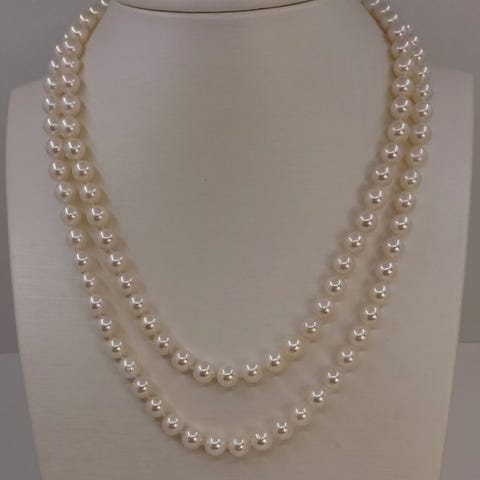 Unik, smuk og stor Akoya-kulverede perler dobbelthalskæde, der graduerer fra Ø 8 til 8,5 mm, med lås i 925 sølv og dele, nem at have på og med hallmarks. Total længde 43 og 47 cm.
