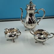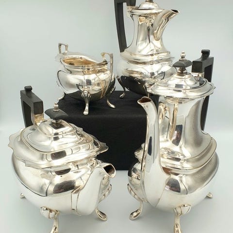 Tidlig-1900-tals cruet-sæt fra Mappin & Webb. Fremstillet af tyk sølvplet, herunder salt- og peberbøsse, sennepsbøsse, ske, 2 klare glasindsatser, den ene med glat reparation vist på billederne. Skeen komplementerer sættet, men er ikke af samme mærke. Fremragende vintage-tilstand; se alle billederne for et bedre indtryk. Diameter 10 × 5,5 cm, 7 × 5 cm, peberbøsse 10 × 3,5 cm, ske 11 cm, vægt 380 g