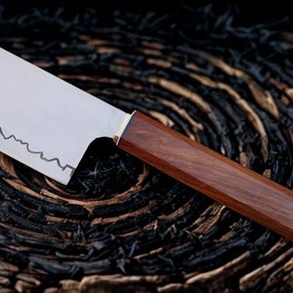 Dette er en bemærkelsesværdigt smedet og håndfremstillet køkkenkniv fremstillet af de fineste knivmager fra USA. Dette er en meget flot håndlavet serbisk tung køkkenkniv til hakning, høj kulstof, smedet stål, rosentræ håndtag, multilags smedet stål, læderskede. Kniven har et behageligt greb. Bladet er af særligt smedet stål med en høj skærekant. Denne kniv er såvel en samlergenstand som et nyttigt køkkenredskab. De længste knive har en cirka 32 cm længde.