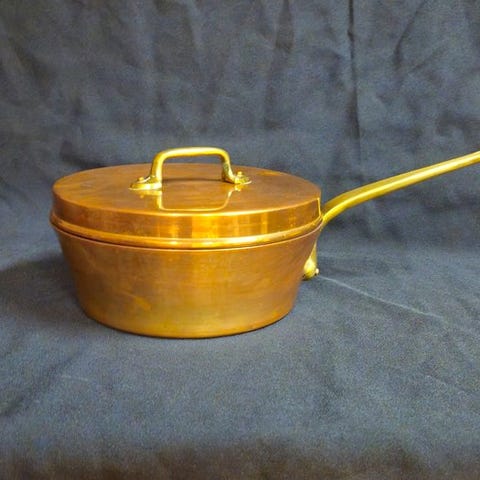 Eksklusiv vintage kobbergryde med sit originale matchende låg, fremstillet af den prestigefyldte schweiziske producent **Spring** fra deres anerkendte **Culinox**-serie. Dette stykke repræsenterer kulinarisk håndværksmæssighed på højeste niveau ved at forene den overlegne varmeledningsevne i tungt kobber med holdbarheden og hygiejnen ved en indvendig høj-kvalitets rustfrit stål.