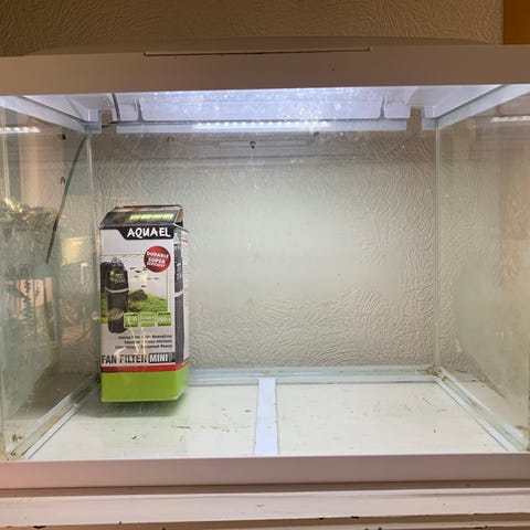 Der kan være lidt kalkpletter og almindelige brugsspor på glasset. Hvis man vil have det helt pænt, kan man bruge lidt eddike og derefter skylle akvariet grundigt, før det tages i brug. Kalkpletter er helt normale i akvarier og kommer ofte igen efter nogle uger.😬