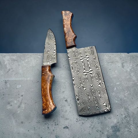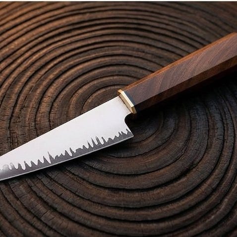 Den smedede kniv er lavet af japansk 440C-stål med en hårdhed på 58 Rockwell. Alle smedede knive er håndsmedede, hvilket gør hver enkelt unik. Kniven har en bladtykkelse på 2 mm og en skærevinkel på 18 grader. Santoku-kniven leveres i en luksuriøs træboks.