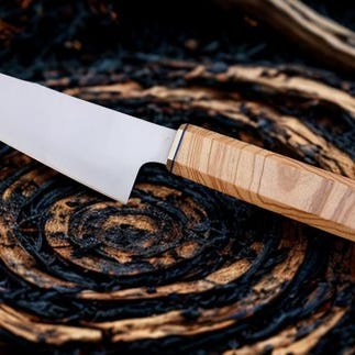 Håndtaget er lavet af oliventræ. Bladet er forsynet med små fordybninger, så mad ikke hæfter sig så hurtigt fast på bladet.