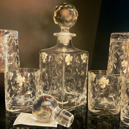 Flot whisky sæt i Bohemiakrystal købt i 1990’erne og holdt lukket i en krystalvitrine, aldrig brugt.