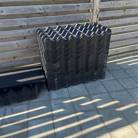Bølgeplader tagplader i grå farve. Pladerne har bølgeprofil og egner sig til tagdækning eller overdækning af f.eks. skur, carport eller lignende konstruktioner. Tykkelse og præcise mål fremgår ikke, men kan ses på billederne med tommestok. Velegnet til udendørs brug, hvor der ønskes en enkel og funktionel tagløsning.