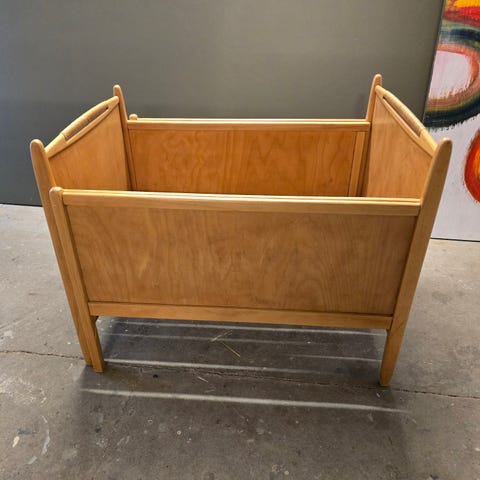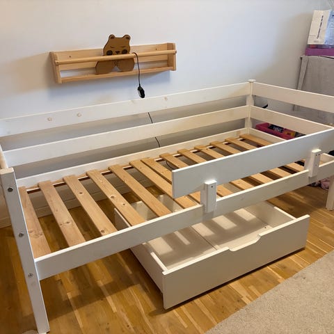 Juniorseng i træ, malet i lyseblå. Sengen har tremmegavl i den begge ender og lukkede sider, samt lamelbund i træ. Sengen kan trækkes ud så den bliver 160 cm i længden. Velegnet som overgangsseng til mindre børn. Farven fremstår ensartet med enkelte mindre mærker i malingen, der giver patina. Skummadras medfølger