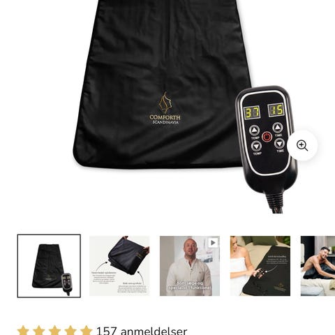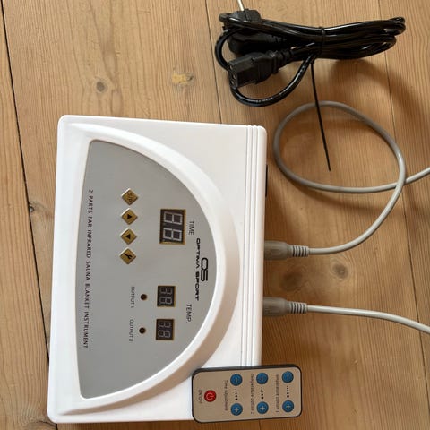 Infrarød varmetæppe med ekstern elektronisk kontrolenhed. Tæppet tilsluttes strøm via medfølgende kabler, og kontrolboksen har knapper og display til indstilling af varme og tid. Velegnet til liggende brug, f.eks. på seng eller sofa, hvor kroppen kan omsluttes af tæppet for jævn varmefordeling. Materialet er glat og aftørringsvenligt. Egnet til hjemmebrug, hvor der ønskes justerbar infrarød varme.