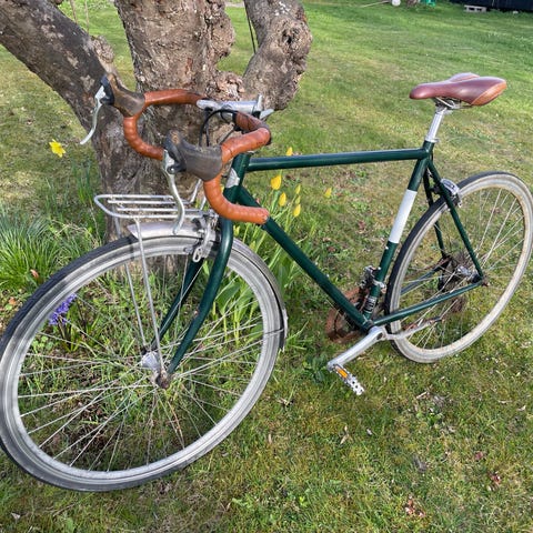 MBK racer herrecykel med 53 cm stel og 28"/700c hjul. Cyklen har fladt styr og smalle dæk, velegnet til kørsel på vej og længere ture. Stel og forgaffel fremstår i en mørk farve med blå detaljer. Udstyret med skivebremse foran. Egnet til mandlig rytter, der ønsker en racerorienteret cykel til pendling eller træning på asfalt. Kan eventuelt leveres for mindre beløb.