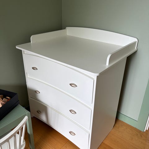 Aftagelig pusletop i træ, som kan bruges som pusleplads til baby. Når pusletoppen fjernes, fungerer møblet som almindelig kommode til opbevaring i børneværelse eller andre rum. Neutralt design i kombination af hvid og egetræ.