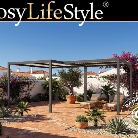 San Pablo er en moderne og elegant bioklimatisk pergola pavillon fremstillet i stærkt, vedligeholdelsesfrit pulverlakeret aluminium. De justerbare taglameller betjenes nemt med håndtag, så du kan regulere lysindfald, skygge og ventilation efter behov. Dette sæt indeholder to komplette San Pablo pergola pavilloner, som leveres med solide beslag, så de kan sammenkobles sikkert til én større konstruktion. Hver bioklimatisk pergola pavillon kan også anvendes separat. Sidevægge/skærme kan bestilles separat!