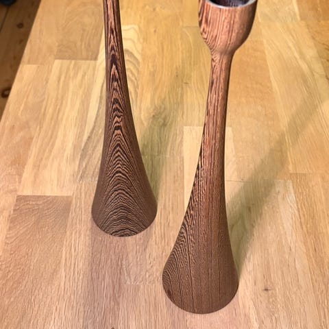 Sættet består af tre lysestager i røgfarvet eg (smoked oak) i forskellige højder, formet til kronelys.