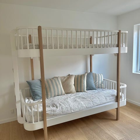 Sengen er brugt igennem en del år og har nogle brugsspor. Man kan se på billederne hvor malinger har fået lidt skrammer på trin og lignende. Sengen fejler ellers intet og vores søn har være mega glad for den.