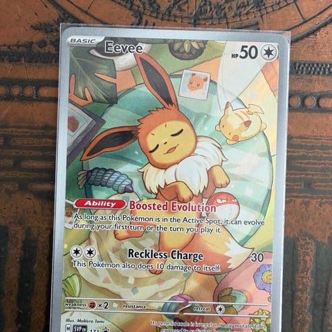 Pokémon Eevee V samlekort. Motivet viser Pokémon-figuren Eevee i V-version med 190 HP, angrebene Collect og Brave Buddies samt tilhørende energisymboler og korttekst. Bagsiden er standard Pokémon-kortbagside med Poké Ball-design. Egnet til samling eller brug i Pokémon Trading Card Game.