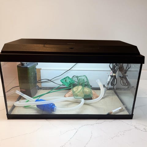Akvariet er brugt, men står fint og virker som det skal. Der kan være lidt kalkpletter og almindelige brugsspor, som er helt normalt på brugte akvarier. Kalk kan fjernes med eddike, og bagefter skal akvariet bare skylles godt igennem.