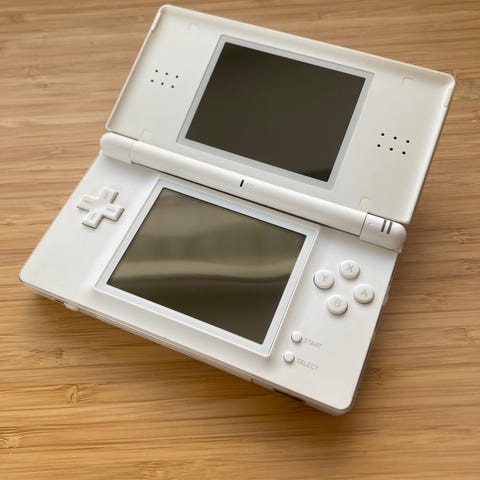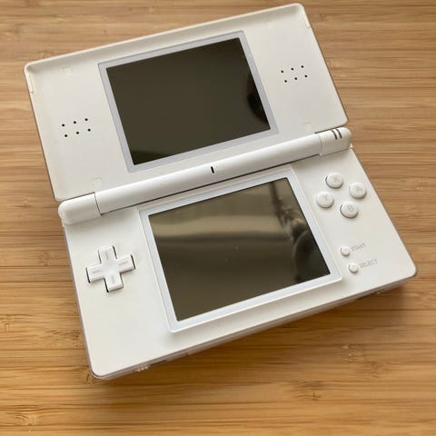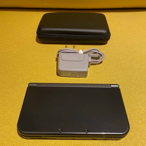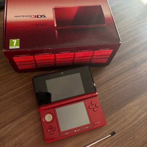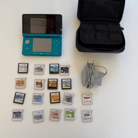 Modded Nintendo 3DS håndholdt konsol i hvid. Der følger oplader & stylus-pen med.