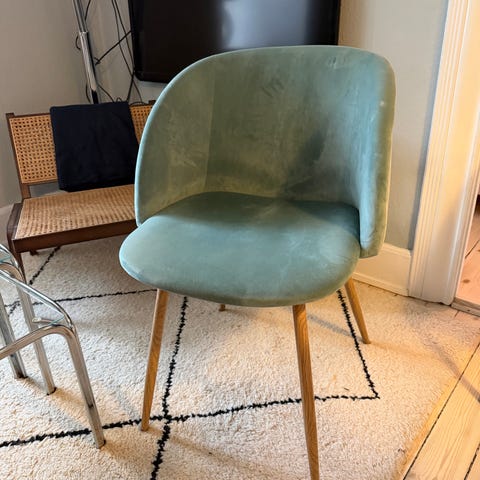 Søstrene grene velour stol i grøn med træ lignende ben i metal.