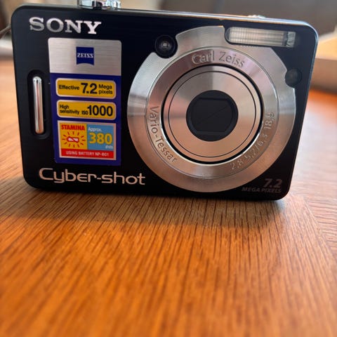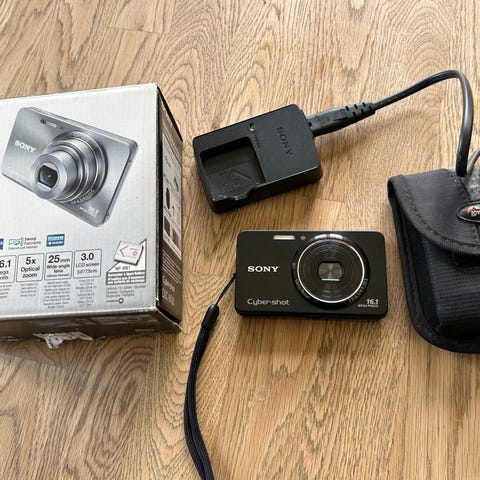 Sony Cyber-shot digital kamera i sølvfarvet metalhus. Model w80. Med batteri, oplader , kort og etui. Fungerer fint. Kompakt model med indbygget zoomobjektiv og bagpå placeret farveskærm til visning og menuvalg. Kameraet har betjeningsknapper på bagsiden samt håndledsrem monteret i siden. Velegnet til generel hverdagsfotografering og rejsebrug, hvor et lille og let kamera er ønsket.