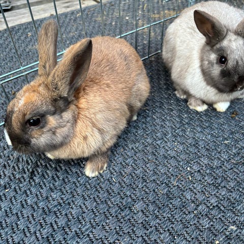 De er ca. 1 år gamle og er en blanding af minilop og lionhead, hvilket giver dem et super sødt og blødt udseende.