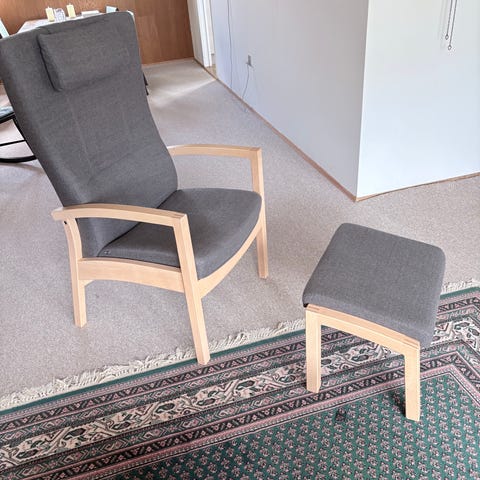 2 stk lænestole, 1 stol og 2 stk skamler