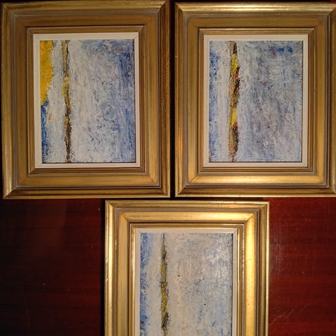 Sæt med to billeder med blomstertryk i lyse blå og beige nuancer. Velegnet som vægdekoration i f.eks. stue, soveværelse eller gang.